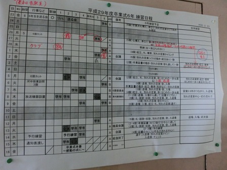 練習日程がしっかり示されています。6年生を送る会直後から、毎日練習を重ねています。