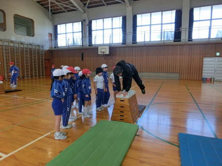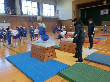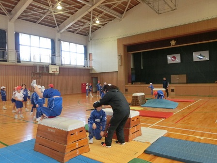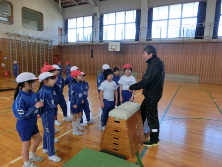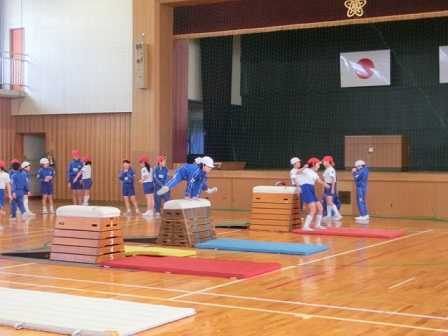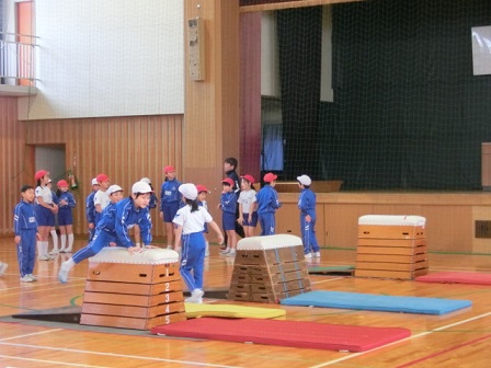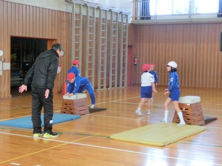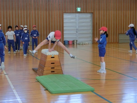 3年生が4年生になって出場する器械運動交歓会にむけ、跳び箱の練習を始めました。そこへ、(5年生同様)こちらもまた強力な助っ人が来て下さいました。クラブパレットの指導員、西田さんと安達さんです。飛べるようになるためのポイントは、走るリズムとグーパーグーの足の動き(踏み板はグー、飛ぶときはパー、着地でグー)、あと手の跳び箱を「強く押し払うような動き」でしょうか。今日、初めて台上前転にチャレンジした子がたくさんいました。練習したら、もっともっと上手になりますね。