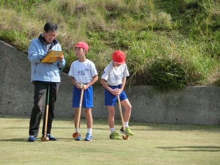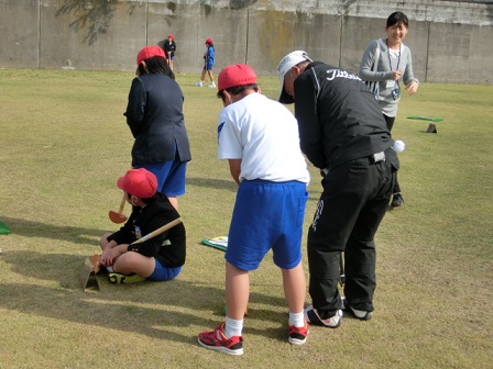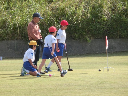 台風一過、秋晴れの今日、4年生が地域の方々とグラウンドゴルフで交流しました。6月に学校の運動場で行ったのが1回目、今日はすみよし広場で2回目を行いました。1回目の運動場とは違って今回は芝の広場。1打目での力の入れ具合がうまくつかめなかったようですが、徐々にコツが分かり、子どもたちは、のびのびとプレーしていました。初めに遠くから名人さんがホールインワンを決めた時には、わぁ~と歓声が上がっていました。