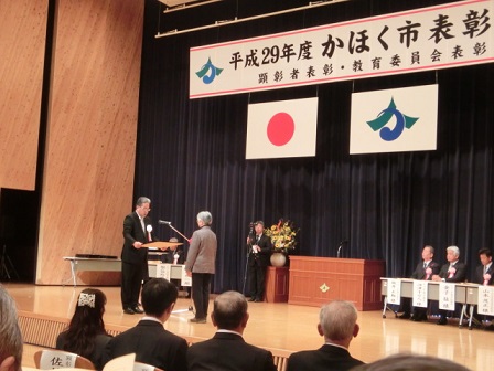 2017年10月29日 15時03分 28日(土)~29日(日)に、かほく市生涯学習フェスティバルがあり、土曜日に教育委員会表彰式が行われました。教育功労賞の団体部門に「絵本サークルそらいろのたね」が選ばれ、その代表として竹内さんが出席なさっていました。本校の学校運営協議会委員の竹内さんです。いつも貴重な意見をありがとうございます。また子どもたちへの読み聞かせ等でもお世話になっています。おめでとうございます!今後ともよろしくお願いいたします。