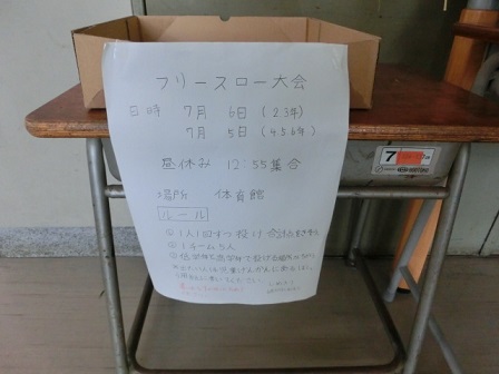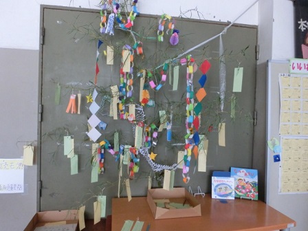 児童玄関の図書委員会スペースにも七夕飾りが登場しました。自由に願いごとが書けるようになっています。また、その横には、体育委員会がフリースロー大会を企画したようで、参加申し込み書が置かれています。楽しい企画です。学期末で、各学年とも勉強の追い込み?まとめを行う時期になりました。そんな中で、楽しい企画に参加するのもいいですね。