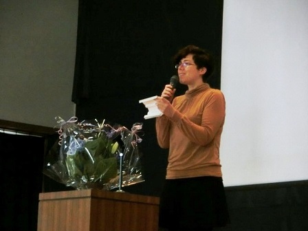 6年生の代表児童が、お礼の言葉と花束を。