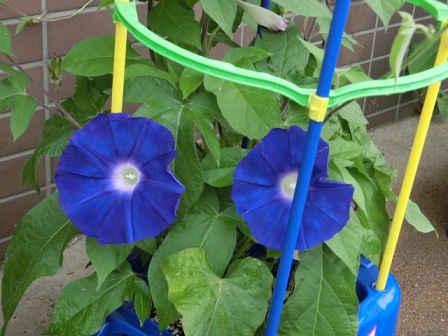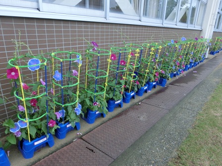 1年生のあさがおが次々と咲き始めています。一人の植木鉢に3~4つ程の花が咲き、きれいな「あさがおロード」になっています。お天気がいい日は、毎日お花の顔を見てあげるといいですね。
