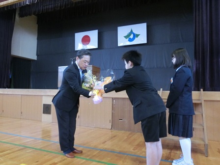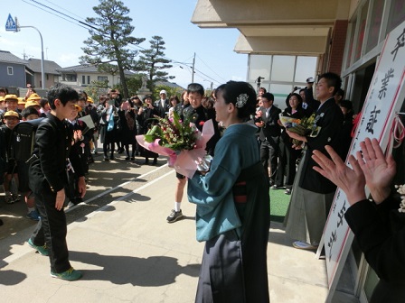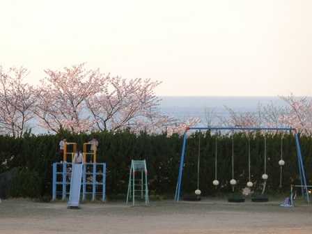 桜のピンクと海の水色がすごくきれいです。これも外小自慢のながめです。