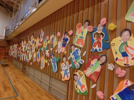 1年生は紙版画で作った思い出の学校生活です。カラフルな作品がずらっと廊下に並びました。通りかかった私が、「上手だね。廊下がパッと明るくなったね」と伝えると、一人の女の子が、「新しい学校みたい!」と言っていました。改修を控えた校舎をそう言ってくれる素敵さに感動しました。
