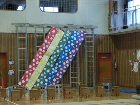 いよいよ明日は、6年生を送る会です。今日の午後から、体育館廊下や体育館の飾り付けが行われました。
