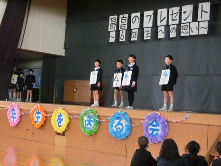 今日、「最高のプレゼント~6年生への思い~」のスローガンのもと、6年生を送る会が行われました。みんなのありがとうの気持ちがたくさん詰まった、まさしく最高のプレゼントを贈ることができた会となりました。また、それぞれの学年の成長が見取れる会ともなりました。見守って下さった来賓(お世話になった地域の方々)の皆様、保護者の皆様、ありがとうございました。