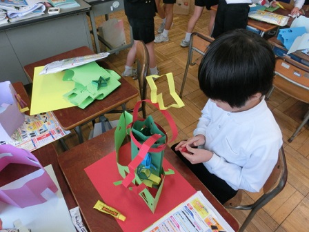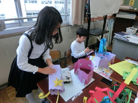 校内を歩いていると、何だか楽しそうな図工の風景を目にしました。4年生が「夢のお城」というタイトルで、それぞれが自分らしい工夫でお城を作っていました。カラフルで面白そうな仕掛けがいっぱいのようでした。できあがりが楽しみです。