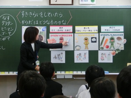 今日、1年生で食育の授業「すききらいをなくそう」が行われました。宇ノ気小学校の栄養教諭の小鹿山先生に、ゲストティチャーとして来ていただいて、担任と二人で授業を進めました。給食には、いろいろな食品がバランス良く入っていることを知り、苦手なものも食べようとする意欲を高めるための授業です。自分のすききらいについて話したり、すききらいをしていたら、どんな体になるのかを話し合ったりしました。給食にでた食品を3つのグループ(赤・黄・緑)に分け、それぞれの働きを教えてもらいました。そして「三匹のこぶた」の紙芝居を通して、偏った食事の悪影響について考えました。