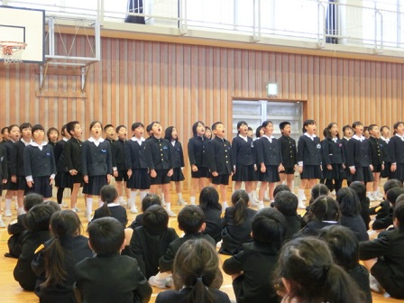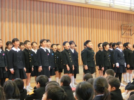 11月30日(水)に行われた全校集会で、追い込み練習を行っていた4年生の音読発表が行われました。北原白秋の詩やサトウハチローの詩の音読です。群読(ぐんどく)といって、様々なパートに分かれて詩を暗唱します。それに、サトウハチローにちなんで、秋になったら必ず歌う「小さい秋みつけた」を歌いました。強弱があって高音がきれい!来年の音楽会を意識したかのような素晴らしい歌声でした。