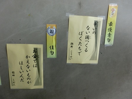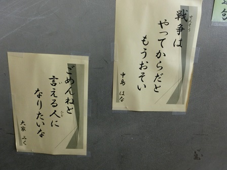 8月に行われた「鶴彬かほく市民川柳コンクール」の入賞作品を紹介します。今回、本校からたくさんの子どもたちが入選しました。また最優秀句にも入選しました。とても素晴らしい結果だったので、全校集会で紹介し、全校のみんなに見てもらおうと、校内(児童玄関横の階段)にも掲示しました。子どもの目線って素晴らしいです。物事の本質を端的に言い当てていますね。