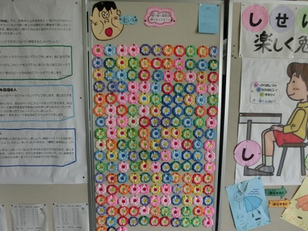 先日もお伝えした家庭学習カードの取組ですが、秋本番を迎え、その取組が進んでいます。1枚目のピンクカードが終わった人は、2枚目の青色カードに進んでいます。そして、児童玄関には「努力の花」として名前入りのお花が飾られています。