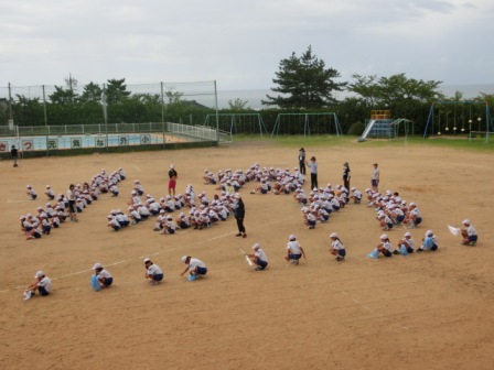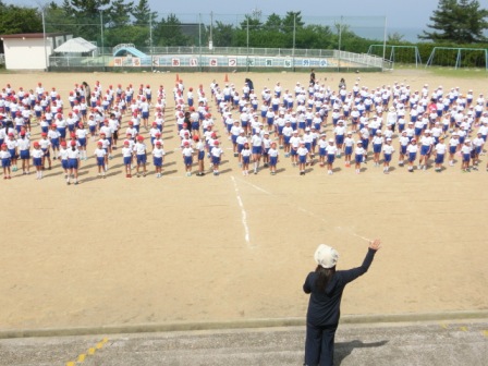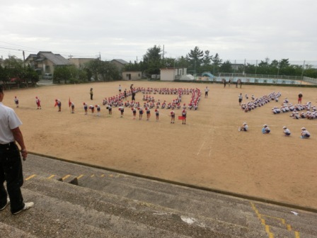 今日の5限目に初めての応援練習が運動場で行われました。人文字隊型のある応援合戦は、外小ならではの、「伝統の演目」です。(巨大スタンドがあるからこそ見応えがあります)途中で黒雲が運動場を通過し、大きな雨が一時的に降り、一旦は児童玄関まで避難しましたが、少しして晴れたので、人文字は最後までやり切りました。さて、それぞれの表した文字には思いがこもっているのですが、何の漢字か分かりますか?ぜひお子さんに聞いてみて下さい。もっと分かりやすくするために、画と画の間隔を変えたり、「はね」を省いたりして、更にバージョンアップすると思います。お楽しみに。