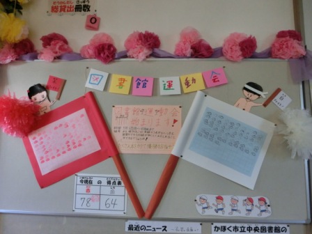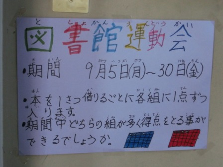 運動会練習真っ盛りですが、別の運動会も、もう行われています。図書館運動会となかよし掃除による赤白無言清掃対決です。