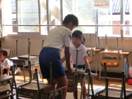 通りがかったら、ちょうど6年生が、小さい子が机を運ぶのを手伝っていました。