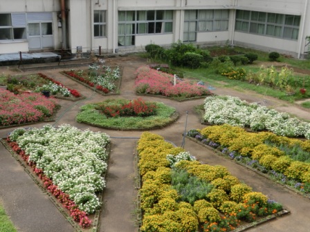 時々お伝えしている中庭花壇。多くのボランテァさんと一緒に花植えをしたので、枯らすまいと、必死で暑い夏休みも水やりに励みました。この頃やっと水やりからは解放されています。花的には恵の雨。でも運動会練習では困った雨・・・微妙です!中村さんが時々肥料をやって下さり、今はこんな感じです。運動会の折りにでも、ご覧頂ければと思います。