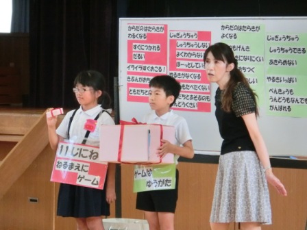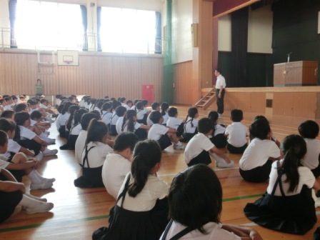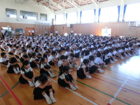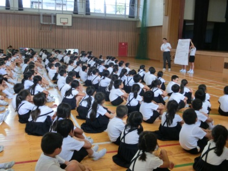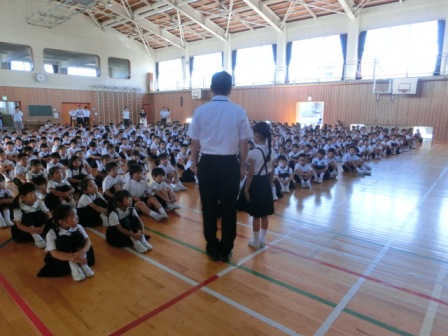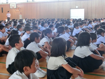 初めに図書担当から読書賞の表彰、次は私の話。内容は、①1学期のふりかえり②「あとまわしおばけ」の話とその退治の仕方(計画を立てて宿題をすること、夏休みだからこそ自分のおもしろいとおもえることに挑戦・チャレンジすること)③命の大切さ(交通事故や水の事故に遭わないように、自分の命は自分で守ること)でした。