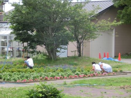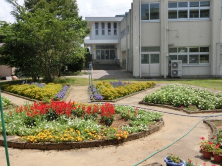 夏の暑さにも負けず、環境委員や職員で、中庭花壇のお花のお世話をしています。草むしりに来て下さった地域の方々もおいでます。そのお陰で、近年にはない見事な花壇になっています。このまま、花々にも夏の暑さに負けないで咲き続けて欲しいです!