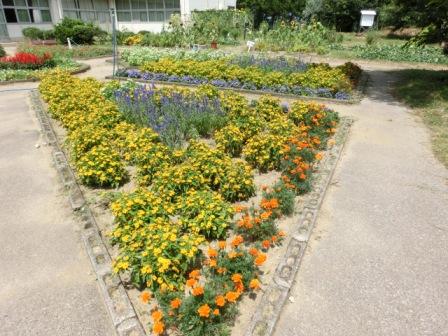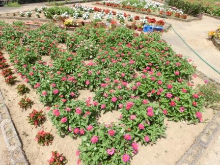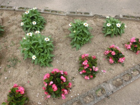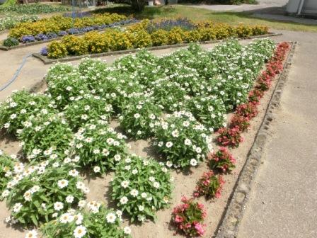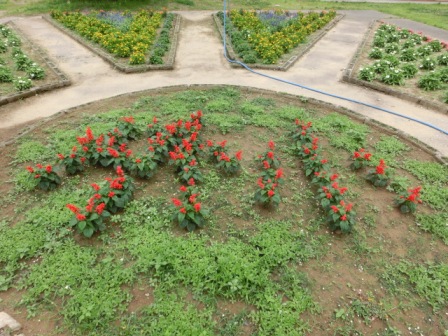 PTAだよりのページで、「中庭花壇の真ん中は?」といった内容を書いて下さっていたと思うので・・・撮ってみました!サルビアで『外小』と書いてあります。植えたときに子どもたちが気付いて喜んでいました。中村さんの粋な工夫です。