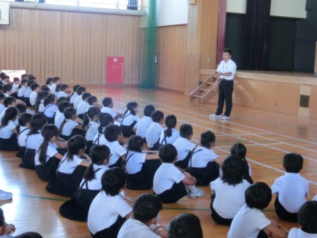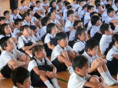 生活のきまりについて聞いています。大変暑い日でしたが、子どもたちの目が素敵でした。