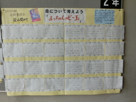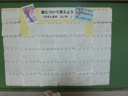 クラスに戻り、各学級の先生から、戦争や平和に関する本の読み聞かせを聞いて、感想をカードに書きました。