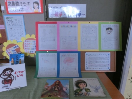 ちなみに児童玄関には、図書委員がお勧めする「戦争と平和」に関する本が展示されていました。
