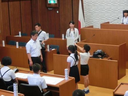 昨日、8月8日(月)にかほく市子ども議会が行われました。本校からは、質問者2名と誓いの言葉2名の4名が参加しました。質問者はその内容を考え、分かりやすく伝えるための文章を何回も練り直しました。誓いの言葉担当も、何回も練習し二人の息を合わせました。全員が外小代表として、それぞれの役目をしっかりと果たしてくれました。