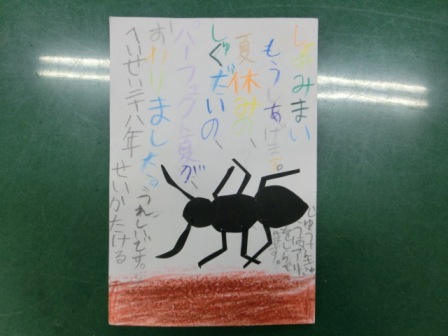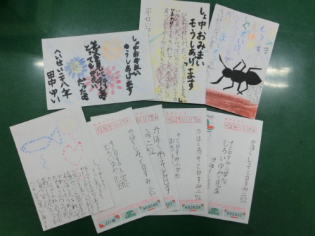 2年生の学習ですが、8月上旬の全登校日を過ぎた頃から、続々と暑中見舞いの葉書が学校に届いていました。とっても素敵な試みで、2年生が「暑中おみまいもうしあげます」と書いたり、最後に、「せいか(盛夏)」と書いているところが、さすがでした。葉書の書き方をしっかりお勉強しましたね。担任の先生からもお返事が届いたことと思います。また、年賀状で生かすことができますね。