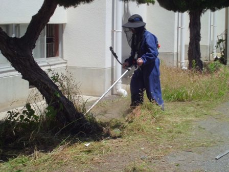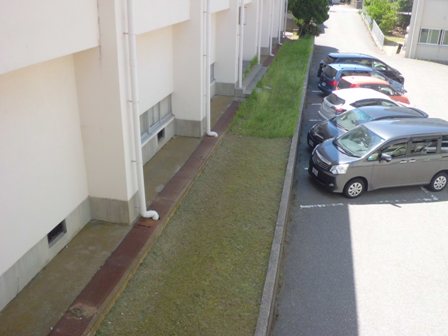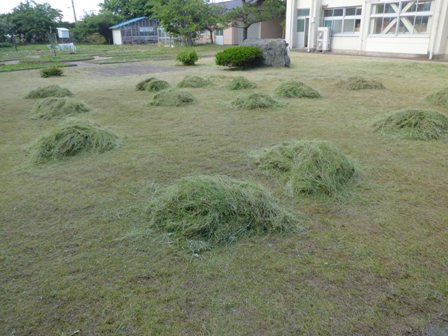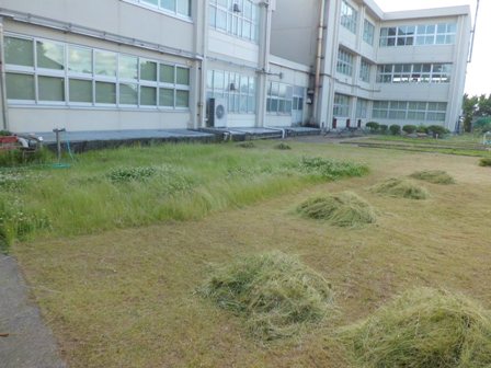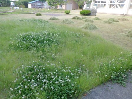 実は、中庭の風景ですが、梅雨前に全部刈っていただこうと思っていたのですが、10人以上の子どもたちが「ここは刈らないで下さい」と言いにきました。理由は、この草が気持ちよくって寝転がって遊びたいからだそうです。ふさふさした草が風になびいたり、シロツメクサがまだ咲いていたり・・・子どもらしいこの気持ちに応え、この一角は残そうと思っています。