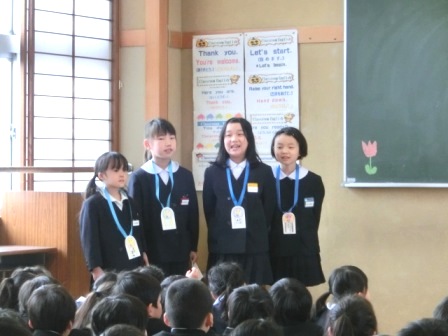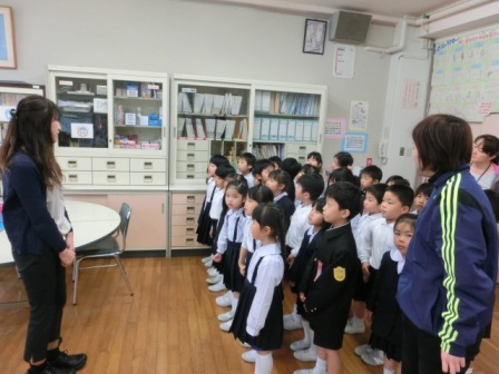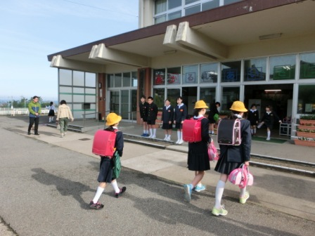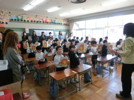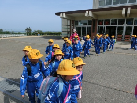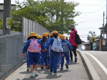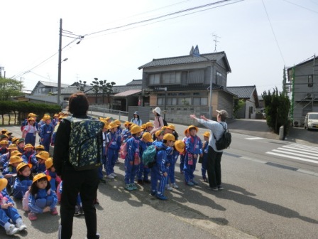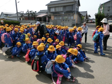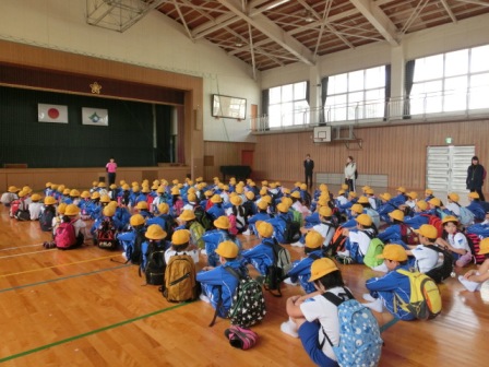 2016年4月27日 11時32分 以前の週間予想では雨予報だった今日ですが、遠足日和となり、子どもたちは元気にうれしそうに出発しました。出発式の様子を紹介します。