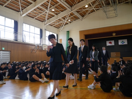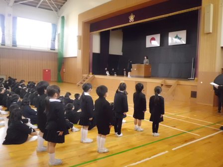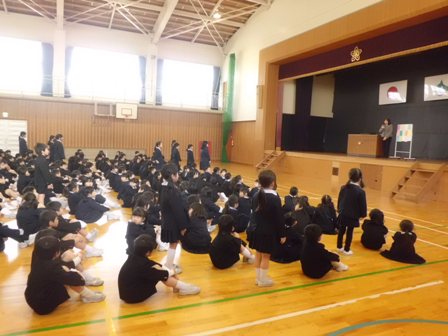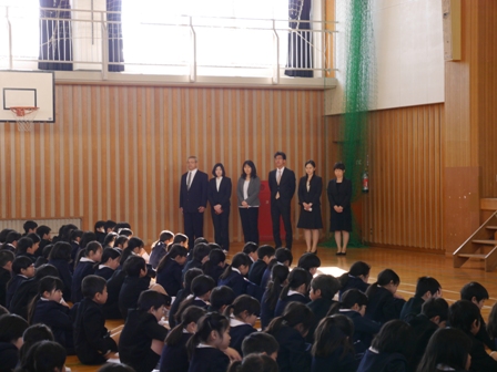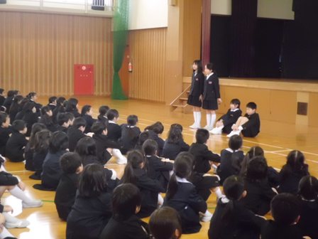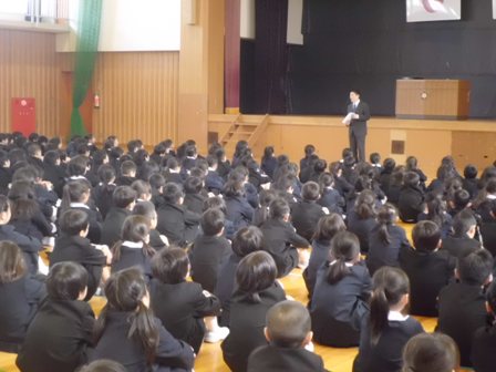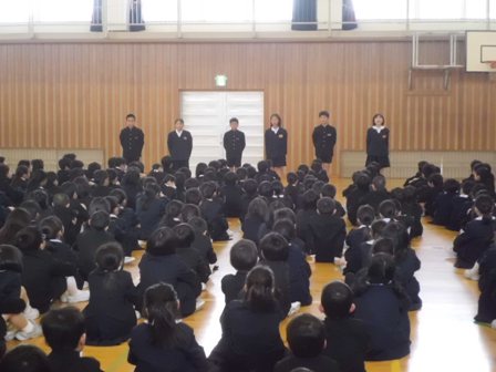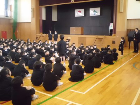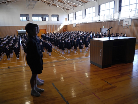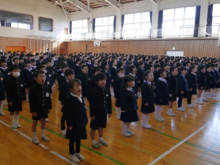 これまでリードしてくれた5年生に全員で拍手をしました。そのあと、5年生は6年生からしっかりと最高学年のバトンを受け取ってくれたこと。その5年生を下級生は見習ってほしいこと、卒業式でも話した「よし、やるぞ!の心のスイッチを入れて、春休みも、自分の良いところは伸ばし、苦手なことはおさらいをしてほしいということ、そして何より交通事故や不審者にあわないように気を付けてほしいということ(自分の命は自分で守ること)を話しました。最後に4月6日の新学期、皆さんの素晴らしい笑顔と「おはようございます」の挨拶に出会えることを楽しみにしています」と伝えました。