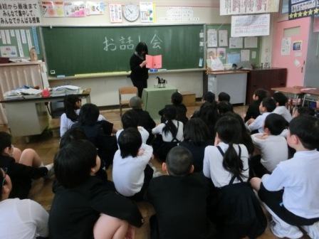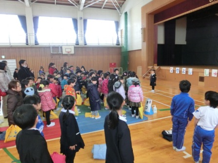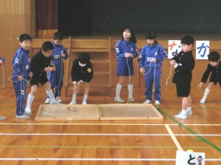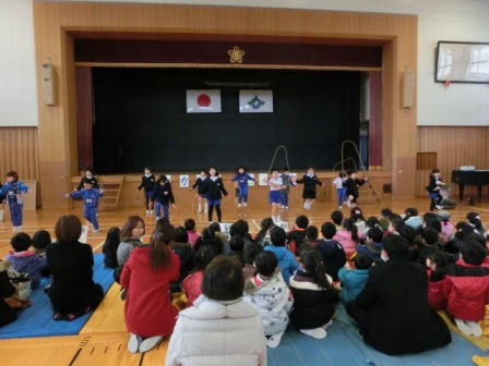 先日、新1年生の体験入学で披露した劇ですが、更にバージョンアップしていました。大きな桃や舟が登場すると会場はどよめき、ももたろうと鬼たちとのけん玉、縄跳び、計算対決などでは笑いも起こっていました。メッセージは「目標に向かって頑張って」でした。表現力の高さにびっくり!