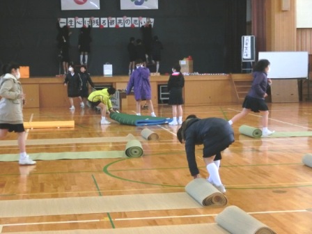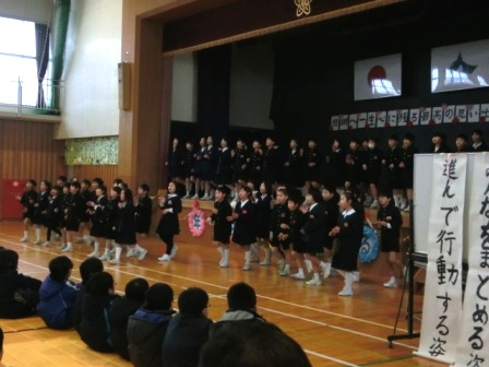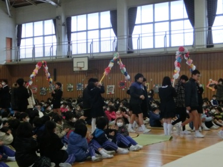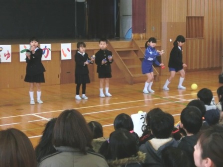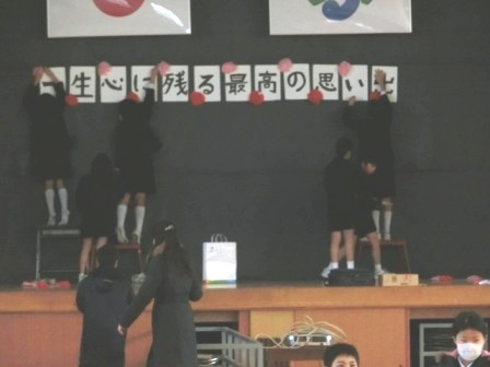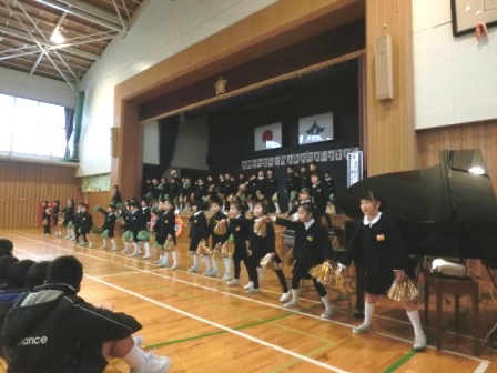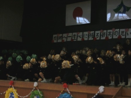 自分たちで詩を作ったって素晴らしいです。写真はステージ上でぽんぽんを使って文字を表しています。カタカナで「アリガトウ」でした。この発想に全校もびっくり、「何の字??」と言っていた6年生がうれしそうに「ありがとうや」と言っていました。みんな大きな声ではきはきと思いを伝えていました。6年生には「自分の宝物を見つけて下さい」とメッセージを送っていました。
