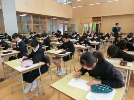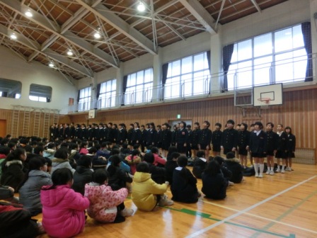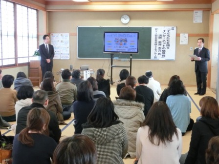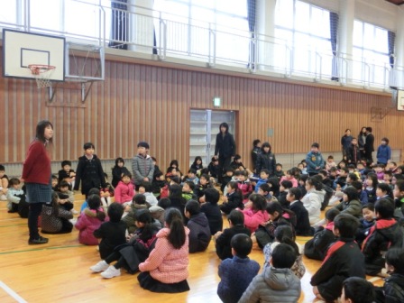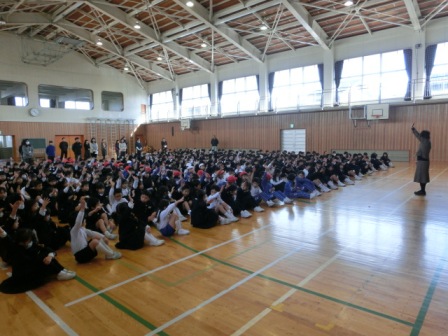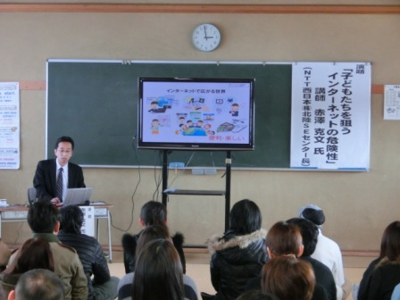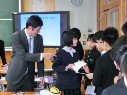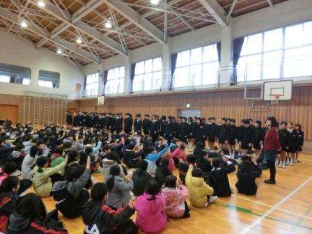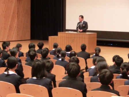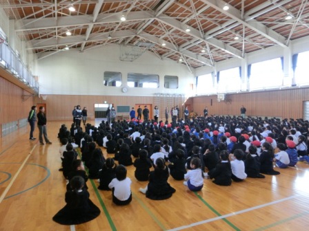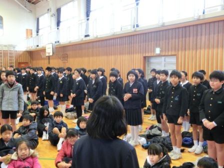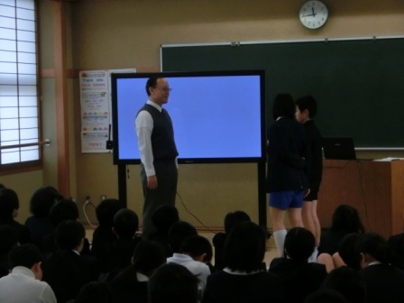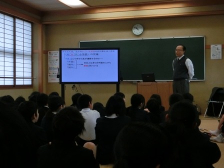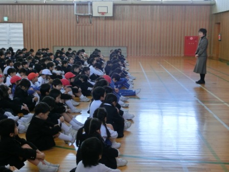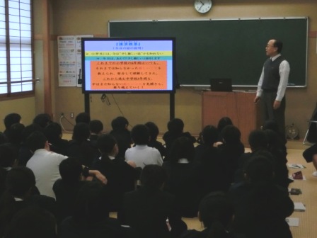 2016年2月10日 15時31分 昨日の3限、6年生を対象とした講演会が行われました。金城短期大学部教授、金城大学国際交流センター長の能雄司(のうゆうじ)先生をお招きましました。能先生は昨年度の市P大会の教育講演会の講師でした。金城高校(現遊学館高校)で体育や国語を担当され、現在は大学のビジネス学科で学生さんの授業を行ったり、国際交流センターで留学生の生活指導等もされたりしています。中学校目前の子どもたちに、広い視野で様々なお話が聞けると思い、講演等でお忙しい方ですが、何とか実現できた会でした。