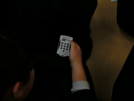 お話の中には多くの質問が準備されていました。子どもたち一人一人にリモコンで回答を選択させ、それがすぐグラフとなって実態がでます。子どもたちに寄り添い話術巧みにお話しされました。