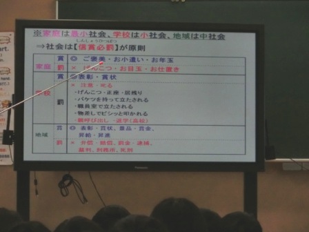 面白かったのは、秀吉のご褒美の曾呂利新左衛門の話でしょうか。グラフも見せて下さいましたが、米粒が初めは見えないくらいだったのが、長い月日の中で膨大な数になることから、目に見えない努力も、続けると一気に成果が見え始めるといった内容でした。その他、「自由と責任」「権利と義務」の話もありました。