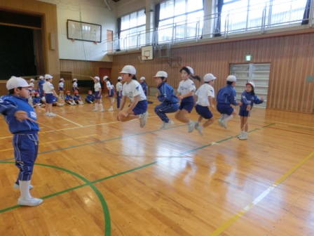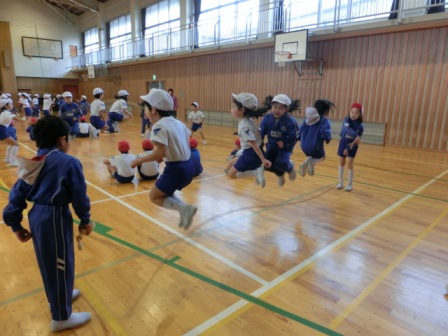 体育館では、2年生2クラスが体育でした。みんなが浮いている!いいジャンプ!