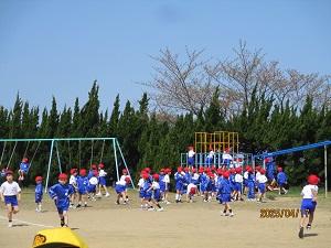 今日は1年生全員で、初めての体育でした。校庭の遊具の使い方を知った後に、みんなで遊びました。青空の中、みんなとても楽しそうでした。