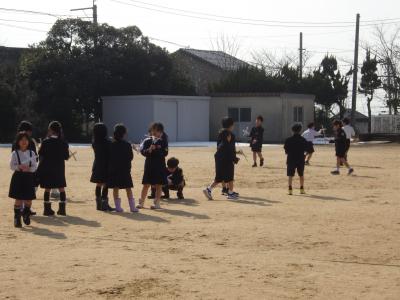 数日前の寒波がうそのように、暖かい日差しが注ぐグランドで1年生が生活科で作成した風車を使って活動していました。