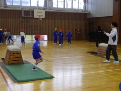 どうしたらうまく跳べるのかアドバイスを聞きながら、何度もチャレンジしていました。