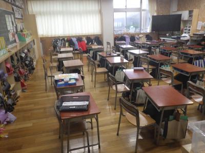 地震発生の放送後、子供達はしっかりと机の下に身を隠していました。