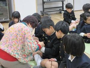 総合「かほく市の先生に学ぼう」の学習で、神後先生方に、ゲストティーチャーとして来ていただき、指編みを教えてもらいました。