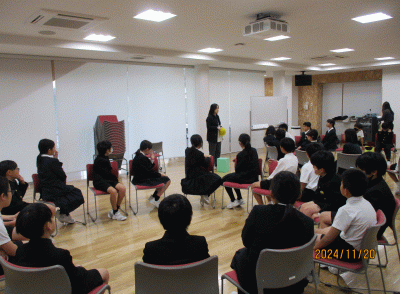 11月20日、西田幾多郎記念哲学館より、職員の方にゲストティーチャーとして来校いただき、哲学対話を行いました。グループに分かれ、『「できません」といっていいか』などのテーマに沿って話し合いました。意見を伝えたり聞いたりする中で、考えの視野が広まった人も多かったのではないでしょうか。