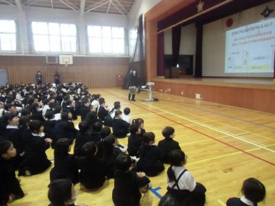 訓練が終わった後、体育館で警察官よりお話をしていただきました。