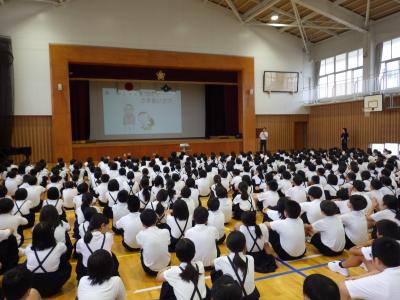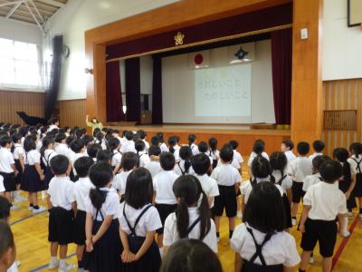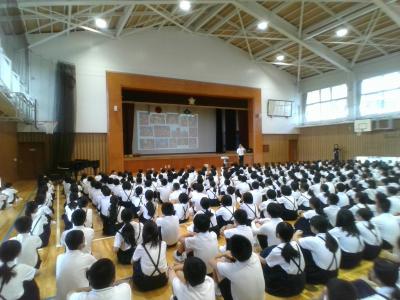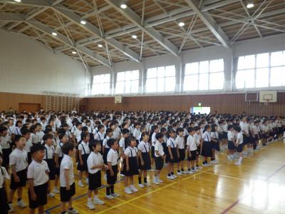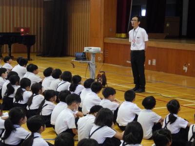 校歌斉唱の後、学校長より、生徒指導より、プール担当より話をしました。