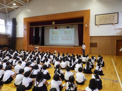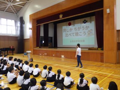 4年生は学年集会を行い、2学期に行われる児童会行事や社会見学についての話を聞いていました。
