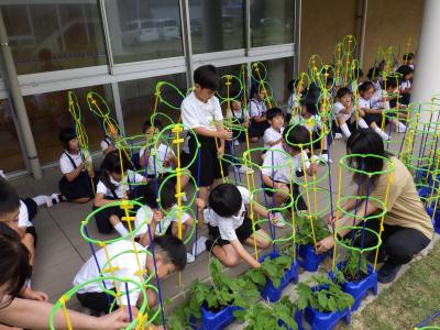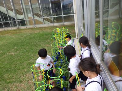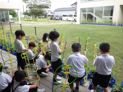 1年生の植えた朝顔のつるが大きく伸びてきたので、各クラス、支柱を取り付けました。
