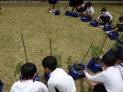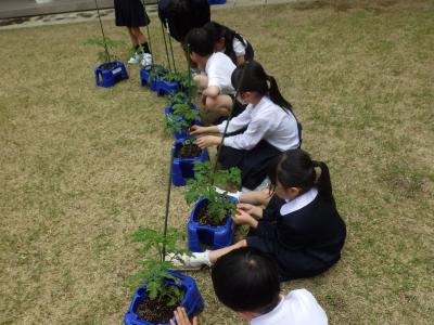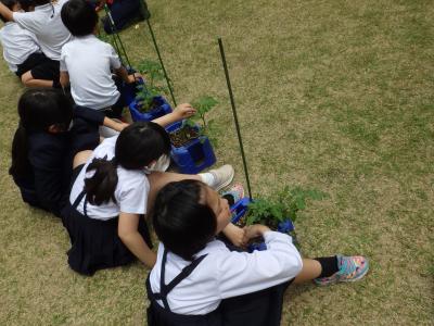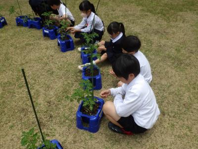 2年生の育てているミニトマトが成長し、つるが伸びたので支柱に固定しました。
