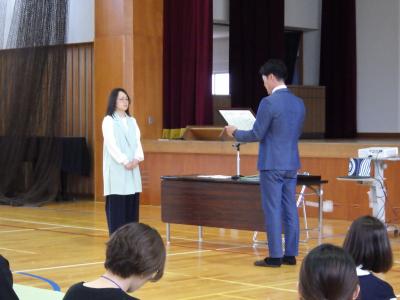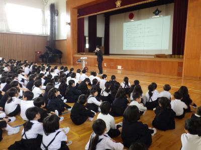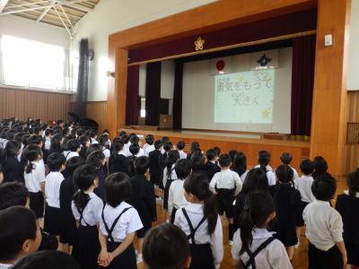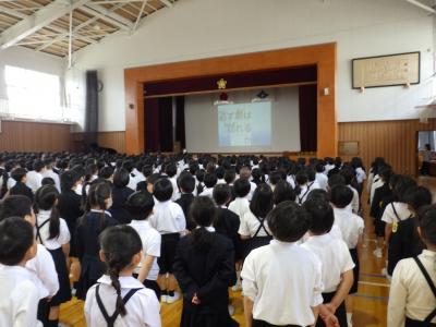 遠足が5月2日に延期となったため、通常授業となり朝学習の時間に学校集会を行いました。