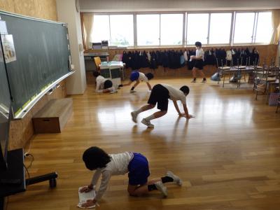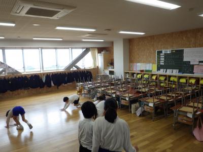 保健委員会のお手本で、低学年もしっかりストレッチをして、心も体もすっきりさせています。